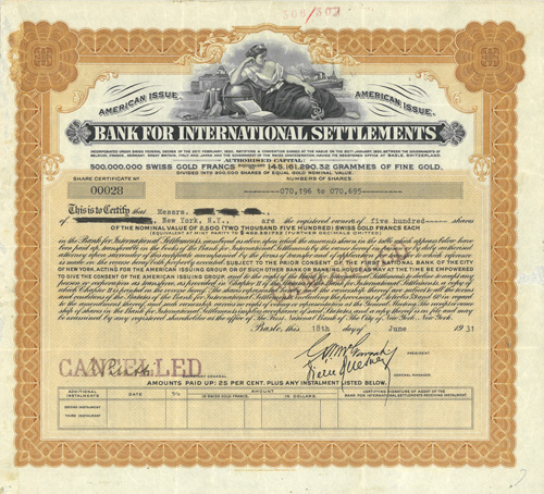 Bank for International Settlements shares certificate, American issue, 1931.