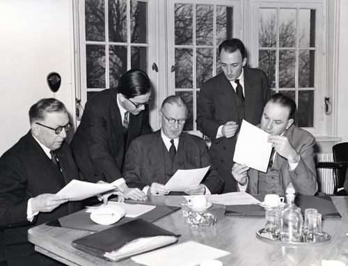 Signature of a BEF 100 million loan agreement on behalf of the European Coal and Steel Community (ECSC), 20 December 1957. The BIS acted as bank agent and depositary for a number of ECSC loans, thereby fulfilling its statutory object of acting as