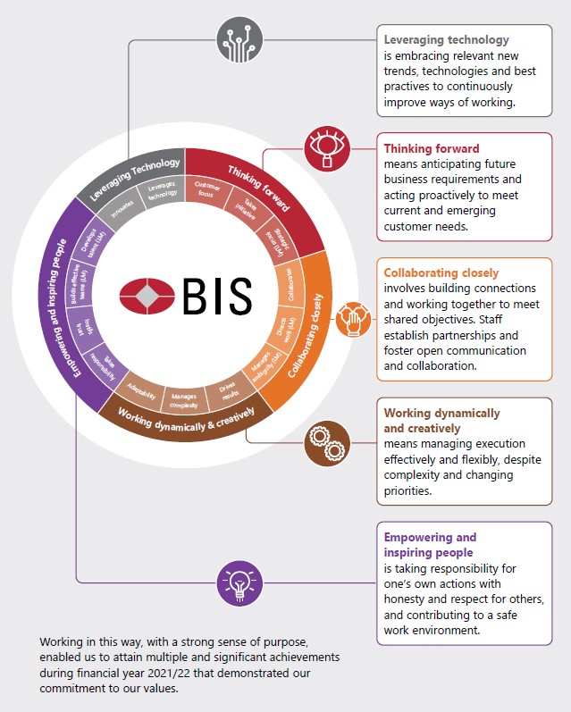 The BIS has defined five behaviours and 15 underlying competencies which, when embraced by staff, allow us to live our values and make the Bank a performance-driven organisation.